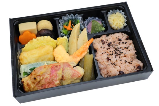 「大」1,350円(税込)=天ぷら(えび天、いか天、かぼちゃ天、おくら天、さつまいも天)/金目鯛の西京焼き/たけのことふきの煮物/煮物四種(花型人参、椎茸、がんも、高野豆腐)/小松菜のおひたし/香の物/桜餅/赤飯(160g)