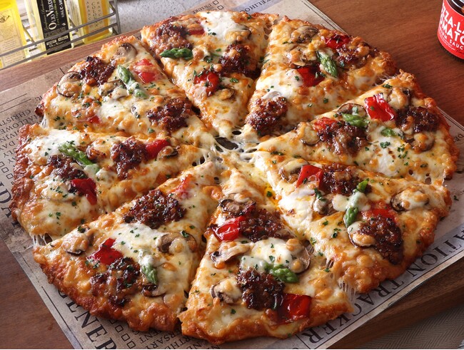溢れ出す牛肉の旨み、クリーミーなマスカルポーネチーズ、野菜の自然な甘みを味わえる、この春の新商品。牛肉を3種の茸やブラックオリーブ、野菜やチャツネと共に、赤ワインで丁寧に煮込み、その旨みをそのまま閉じ込めるよう調理した特製のフィリングをピザにトッピング。とろけるように口に広がる牛肉の旨みをお楽しみいただけます。北海道産マスカルポーネのほんのりミルキーなコクと、どっしり味わい深いビーフの旨みが堪能できる一枚です。