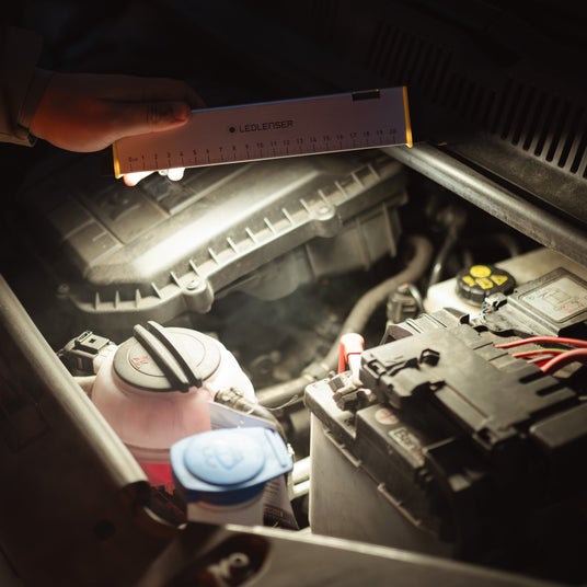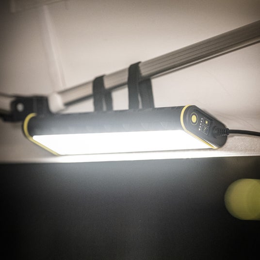 5段階に調整可能な白色光で、ヒューズボックスや車のエンジンルームなど、作業エリアを照らします。2段階に調整可能な赤色光は周囲へ位置を知らせる認識灯としても使用可能です。耐衝撃保護等級IK07の堅牢なアルミニウム製ハウジング筐体で、シリコン製のフックやマグネット、ベルクロなどで様々な位置に柔軟に取り付け可能。充電中の点灯も可能です。