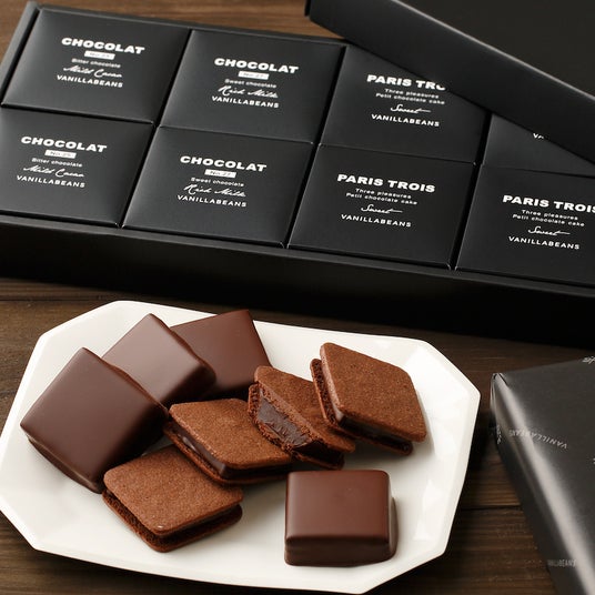 VANILLABEANSのシグネチャー、生チョコサンドの「ショーコラ」とプチショコラケーキ「パリトロ」の人気アソート各種がeギフトでご購入いただけます。「ショーコラ8個入」は2023年6月ジャパンフードセレクションのグランプリを受賞、有名ホテルコンシェルジュ推薦の手土産として2023年12月に雑誌に紹介されるなど、多くのメディアにもご紹介いただいています。