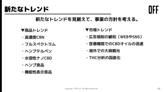 今後の商品・市場トレンドについてもまとめています。合成カンナビノイドの規制、部位規制の廃止、THCの上限値決定等により新しく需要が伸びそうな商品や原料の予測や、広告規制の緩和などの外部環境についても言及しています。
