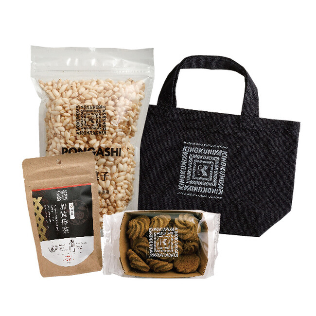 内容:加賀棒茶、ポン菓子ミックス、加賀棒茶のスペシャルクッキー、金沢ミニトートネイビー