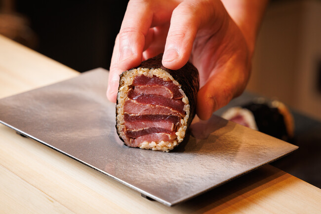 鮨屋の煮切醤油などで漬け込んだ生本マグロの赤身・中トロ・大トロなどの部位をお客様の目の前で、シュラスコスタイルで切り分け、断面が美しいミルフィール状の特製太巻きにして提供します。
