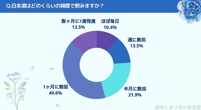 日本酒をどのくらいの頻度で飲むかお聞きしたところ「ほぼ毎日(10.4%)」、「週に数回(13.5%)」、「半月に数回(21.9%)」、「1ヶ月に数回(40.6%)」、「数ヶ月に1度(13.5%)」という結果になりました。