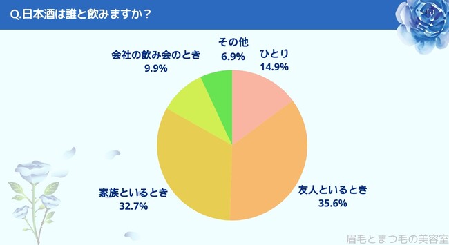 日本酒を誰と飲むかお聞きしたところ「ひとり(14.9%)」、「友人といるとき(35.6%)」、「家族といるとき(32.7%)」、「会社の飲み会のとき(9.9%)」、「その他(6.9%)」という結果になりました。