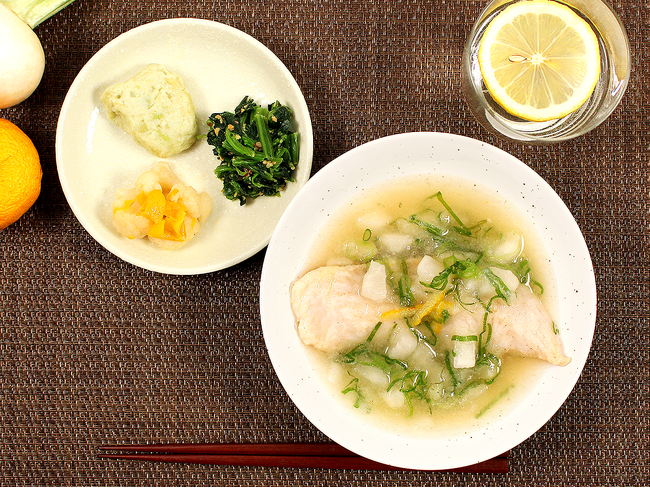 白身魚はやわらかく蒸し上げられ、口の中でほどけるような食感になっています。お出汁香る醤油ベースのたれと、ゆずの爽やかな香りで冬らしく仕上げています。