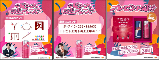 この度、本商品の販売を記念して、本日より新フレーバーを当てる特別な謎解きコンテンツ「#ピンクの謎フレーバー」をレッドブル公式Xにて公開。問題は、クイズ王として知られる伊沢拓司氏が率いる東大発の知識集団「QuizKnock」と、数学や理系ネタを題材とした動画が人気の元・現役阪大生 YouTuber の「積分サークル」のわがくんが共同で制作した超難題となっています。