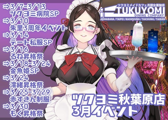 ツクヨミメイドカフェ秋葉原店では、2024年3月もさまざまなイベントが予定されています。