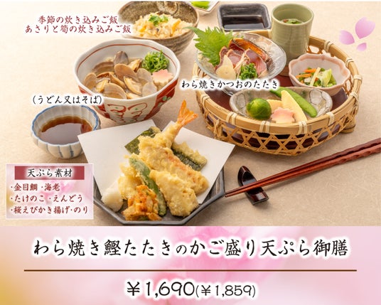 ・わら焼きかつおたたきのかご盛り天ぷら御膳 1,690円(税込み1,859円)