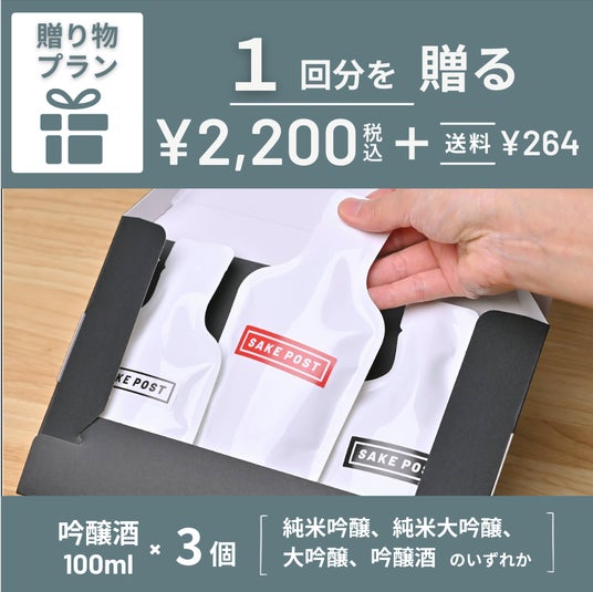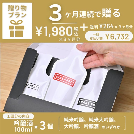 贈り物プランは、SAKEPOST 吟醸プランの3銘柄を贈り物として郵送で届けるもの。通常のSAKEPOSTは3ヶ月からですが、贈り物プランは誕生日や記念日などを想定し、1回分から購入できるようになっています。