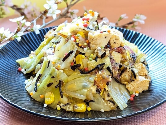 やわらかくて甘みのある春キャベツと、ひじきやコーン、チキンなどの色とりどりの食材を合わせました。フルーティーでスパイスが効いたウスターソースが、野菜のやさしい甘みを引き立てます。