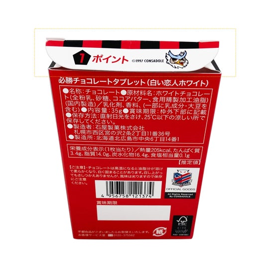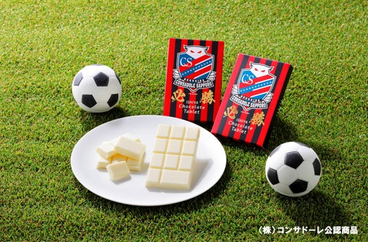白い恋人のホワイトチョコレートをアレンジしたチョコレートタブレットに、北海道コンサドーレ札幌の勝利を願った必勝パッケージが仲間入りしました。試合観戦の合間や、遠征道中のちょっとしたおやつとして食べきるのにちょうど良いサイズです。