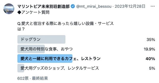 開業発表にあわせて改めてアンケート調査を行ったところ、「愛犬との旅行、宿泊先を選ぶ際に最も重視するポイントは?」という質問に対し、783票の有効回答者のうち51.5%が「部屋の広さ、設備(客室温泉、プールなど)」と回答しました。また「愛犬と宿泊する際にあったら嬉しい設備・サービスは?」という問いに対し、602票の有効回答者のうち40%が「愛犬と一緒に利用できるカフェ、レストラン」と回答しています。この結果からも、愛犬家の方に求められる自慢の施設となっておりますので、会員様以外の愛犬家の皆様にもぜひ一度お越しいただきたいと考えております。