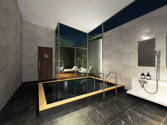 飼い主様にもリゾート滞在を満喫していただけるよう、温泉設備にもこだわりました。敷地内に湧き出る自家源泉を使用した客室内温泉を備えており、プライベートな空間でお楽しみいただけます。全国的にも珍しい黒褐色の「茨城琥珀温泉」で、ph9.2のアルカリ性、1kgあたり64.9mgの天然の保湿成分といわれるメタケイ酸が含まれており、美肌効果が期待できる温泉です。肌の刺激が少なくお肌に優しいため、お子様や刺激に弱い方でも安心してご入浴いただけます。