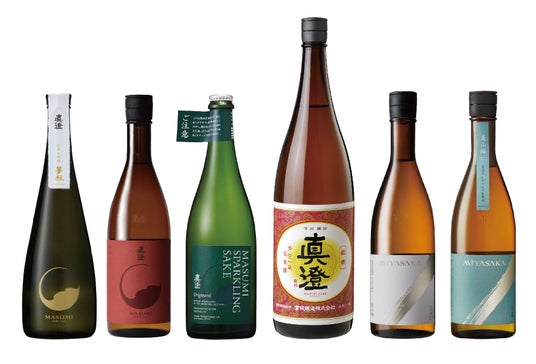 お楽しみいただける銘酒6種│左から「真澄 純米大吟醸 夢殿」「真澄 山廃純米吟醸 真朱AKA」「真澄 スパークリング Origarami」「真澄 銀選 普通酒」「MIYASAKA 美山錦」「MIYASAKA 美山錦 しぼりたて生原酒」