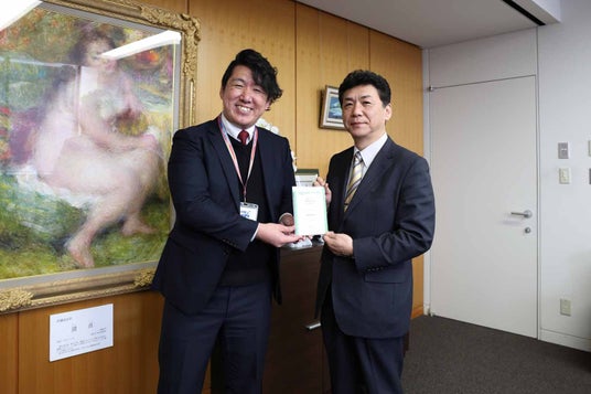 2024年3月4日 楽天ふるさと納税 豊岡市担当(写真左)が市長を訪問し盾の授与を行いました。