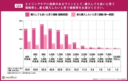 エイジングケア活動にかける金額は5000円未満までの人が半数以上。「全く金額をかけてない/かけたくない」が9%存在する中、抗糖化作用のあるワインの受容価格は「800円~1000円未満」が53%と最も高い結果となりました。