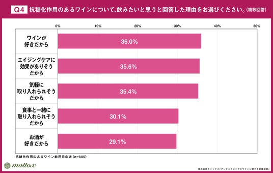 ・抗糖化作用のあるワイン飲用意向としては「ワインが好きだから」が最も高く、「アンチエイジング/エイジングケアに効果があるから」「気軽に取り入れられそうだから」とつづく