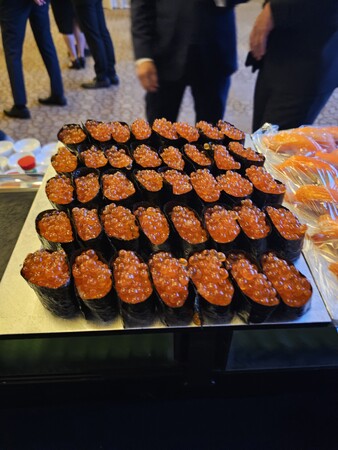 当社では子会社の日本サーモンファームで養殖した青森サーモンをはじめとしたサーモンや魚卵製品を中心に、グローバルに展開したサプライチェーンで外食業や小売業のお客様に幅広い商製品をお届けしています。アジアでは、今回天皇誕生日祝賀レセプションに参加したシンガポールと台湾以外に、マレーシアとタイに販売拠点を設置し事業展開しています。今後も引き続き、アジアに出店を加速する日本食関連外食業、小売業の皆様向けに商製品供給インフラとしての役割を果たしてまいります。