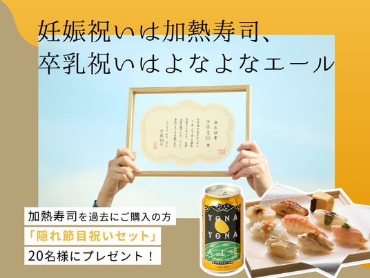 妊娠祝いは加熱寿司、卒乳祝いはよなよなエール。妊娠中に加熱寿司を購入し、卒乳してビールを飲むのを楽しみにしている皆さまが対象です。妊娠・出産・授乳...やっと乾杯できますね!