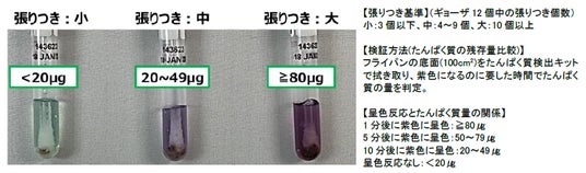 両社でフライパンへのギョーザの張りつき原因を検討する中で、フライパンに残存する汚れに着目しました。これらの残った汚れの主な成分は「でんぷん、たんぱく質、脂質」が挙げられます。そこで、味の素冷凍食品からフライパンへのギョーザの張りつき度合いを確認・洗浄したフライパンを当社に送付していただき、フライパンに残存する「でんぷん、たんぱく質、脂質」の量を確認しました。その結果、ギョーザの張りつき程度が大きいフライパンほど、「たんぱく質」が多く検出されることがわかりました(図3)。
