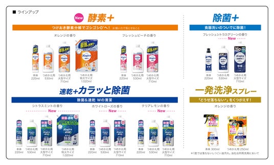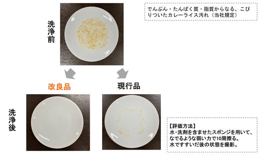 酵素高濃度処方により、油汚れだけでなく、食べ物汚れに多く存在するでんぷん・たんぱく質を分解し、餃子由来の汚れや、生活者に最も落としにくいと思われている(※7)カレーなどの手ごわいこびりつき汚れも軽い力で落とせます(※8)。
