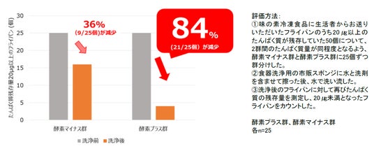 そこで、生活者の方にお送りいただいたフライパンの「たんぱく質」の残存量を測定し、酵素を配合した洗剤で洗浄する酵素プラス群(※3)と酵素を配合しない洗剤で洗浄する酵素マイナス群(※4)で、フライパンに残存する「たんぱく質」が減少するかを確認しました。その結果、酵素マイナス群で洗浄したフライパン25個中9個で「たんぱく質」量が20μg未満になったのに対し、酵素プラス群では25個中21個で20μg未満となりました(図4)。すなわち酵素を配合した洗剤で洗浄することにより、フライパンに残存した「たんぱく質」がより多く除去されていたことがわかりました。