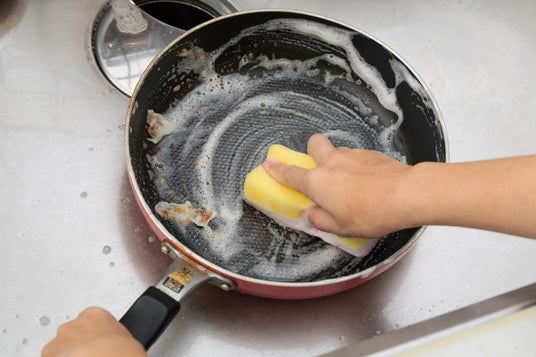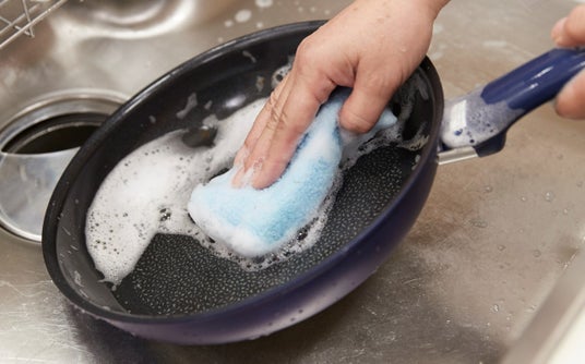 フッ素樹脂加工のフライパンに食材がこびりついて落としにくい場合は、酵素配合の台所用洗剤とぬるま湯を使ったつけおき洗いがおすすめです。