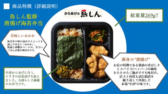 からあげグランプリ最高金賞最多受賞店舗*と海苔弁の最強タッグが実現!中津からあげのレジェンドからあげの鳥しんは王道の「醤油からあげ」、神戸の揚匠しげ盛は特製たれを絡めた「タレ漬け唐揚げ」。絶品唐揚げと子どもから大人まで愛される海苔弁のコラボを実現しました。