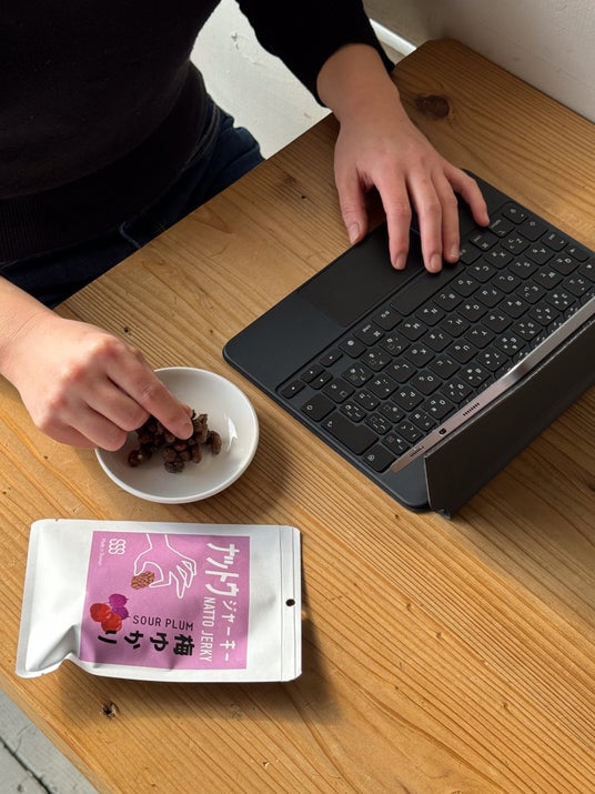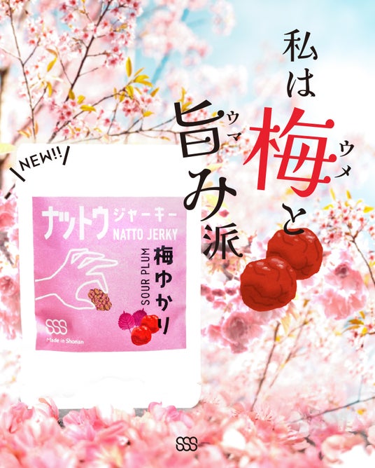 ■ナットウジャーキーの新フレーバー「梅ゆかり味」が新登場!梅とゆかりの爽やかな酸味が、納豆の旨みと相性抜群な味わいに。仕事時のスナックやお酒のおつまみ需要にぴったり。ファンが多い「梅味」を採用。 フリーズドライ製法の紀州南高梅をふんだんに使用し、後を引く味になっています。 梅とゆかりの塩味とのバランスを考えて、国産昆布100%パウダーを入れて旨みをより引き立たせています。 納豆が苦手な外国人にも受け入れられる味として、日本をイメージさせる梅味で製品化をいたしました。