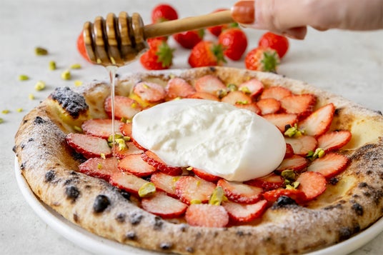 そんな自家製ブッラータチーズのクリーミーな食感に、フレッシュないちごを合わせることでいちごの甘酸っぱさを引き立て、ほどよい甘みがたまらないデザートピザに仕上げました。お好みではちみつをかけてお召し上がりください。