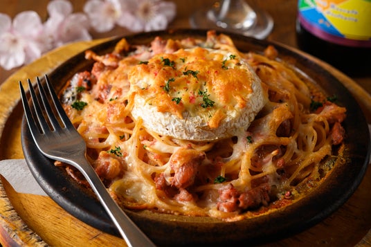 ESOLA名物のパスタを桜仕様に。カマンベールチーズを丸ごとひとつ豪快に乗せた、チーズたっぷりの焼きパスタ。