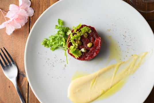 ワインの産地として有名なプーリア地方の郷土料理。新鮮な馬刺しのユッケに、イタリアでは一般的なマヨネーズ仕立てのソースを合わせました。