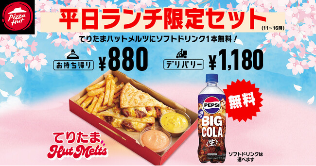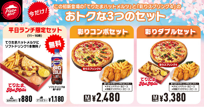 日本ピザハット株式会社(代表取締役社長:中村 昭一、本社:神奈川県横浜市、以下:ピザハット)が展開する世界最大級のピザチェーン「ピザハット」は、春になるとなぜだか食べたくなる“てりたま”を取り入れた「てりたまHut Melts(ハットメルツ)」をはじめ、「カルボナーラHut Melts」「彩りスプリング4」の3つを春限定の新商品として販売開始いたします。 てりたまファン待望の「てりたま Hut Melts」は、コクのあるたまごに相性抜群のてりやきチキンを合わせた春の新定番商品。「カルボナーラ Hut Melts」は、たまごとチーズのコクが絶妙な味わい。「彩りスプリング4」は大人から子供まで楽しめる4種のピザが1枚にまとまった商品です。 さらに、「平日ランチ限定セット」「彩りコンボセット」「彩りダブルセット」という3つのおトクなセットを期間限定で販売し、「てりたま Hut Melts」が選べるソフトドリンク付きで880円(税込、以下税込価格)など、新商品がおトクにお召し上がりいただけます! 春らしいピザハットの新商品との出会いをお楽しみください!