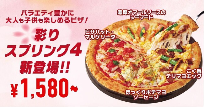 大人も子供も一緒に楽しめる春の4ピザ「彩りスプリング4」も同時に発売開始!春の新商品「こく旨テリマヨエッグ」、オマールソースが春らしい「濃厚オマールシーフード」、人気No.1の「ピザハット・マルゲリータ」やお子様に大人気の「ほっくりポテマヨソーセージ」がこの1枚で楽しめます!