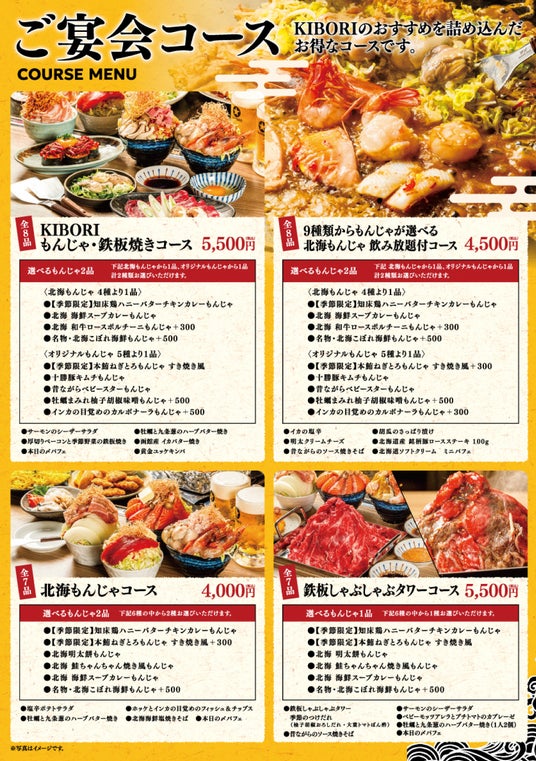 看板メニューをダブルで堪能いただける『KIBORIもんじゃ・鉄板焼きコース』全7品!宴会や飲み会、女子会などにピッタリの当店イチオシのコースです。看板メニューの北海もんじゃやバラエティ豊かな創作もんじゃが選べる充実コースとなっております。