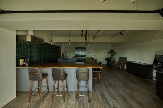 冷暖房・水道・トイレ・電源・Wi-fi・収納棚・コート掛け・カウンターテーブル・椅子(ハイチェアー)9脚・スピーカー(Bluetooth対応)・4口IHコンロ(Miele製)・オーブンレンジ(Miele製)・冷蔵庫(業務用小型×1、家庭用中型×1)、調理器具一式