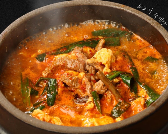 ◆牛ユッケジャンただの“ユッ(牛肉)”ではなく、贅沢な細切りした牛赤身を旨みたっぷりのユッケジャンスープの中に入れて一緒に煮込みました。たっぷりの野菜と溶き卵も相まって大満足間違いなし!ライス・ナムル・キムチや韓国のりがセットになった定食セットがおススメです!