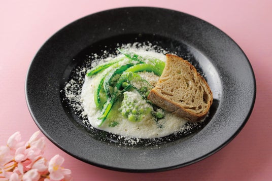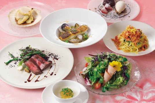 25種類のお野菜とハーブを使用した彩り華やかなサラダや、岩手県から回遊してくる新鮮なホタテと旬の山菜を揚げたフリット、香ばしく焼き上げた春を告げる桜鯛に、旬のお野菜を付け合わせた和牛のビステッカなど、春の味覚を味わいながら満足感のある構成でお愉しみいただけます。