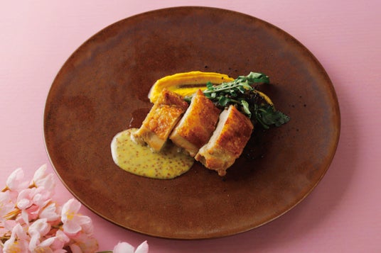 25種類のお野菜とハーブを使用した彩り華やかなサラダに、春野菜と京都・丹波の赤たまごのポーチドエッグ、ローズマリーで香りをつけてローストした京都産のあじわい鶏など、地産地消と春の味覚をお愉しみいただけます。