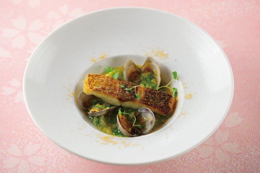 桜鯛のポワレ アサリと菜の花のソース からすみ添え