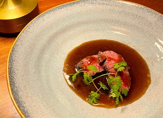 低温調理で仕上げた牛肉のローストです。ソースは中華の伝統的な黒胡椒ソースでお召し上がりください。赤ワインに漬け込んでから調理をすることで、ワインとのマリアージュをより高いレベルで実現しています。フローラルな香りのするジンファンデルでペアリングをお勧めしています。