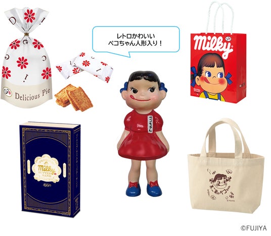 リニューアルを記念し、西洋菓子舗 不二家限定の「ミニレトロペコちゃん人形(水色)」や「不二家のチョコレート 復刻デザイン缶」など人気商品を詰め合わせたお楽しみ袋を発売します。
