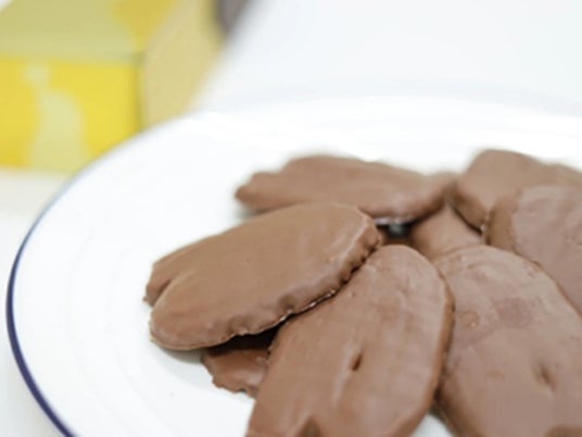 「パイ」なのに「せんべい」と思う不思議な食感と砂糖の甘みや香ばしさを味わいながら、時折しょっぱさを感じる味のハーモニーが楽しい「信長のエビしょっぱい」期間限定商品チョコレート掛けを特別販売