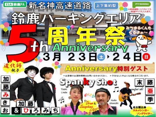 中日本エクシス株式会社 三重支店(三重県四日市市、支店長・山本(やまもと) 武司(たけし))と株式会社ダイナック(東京都 港区台場、社長・綾野(あやの) 喜之(よしゆき))は、2019年3月17日にオープンしたE1A 新名神高速道路(新名神) 鈴鹿パーキングエリア(PA)(施設愛称:PIT SUZUKA)5周年を記念し、3月23日(土)及び3月24日(日)の2日間、「鈴鹿PA 5周年祭」を実施します。