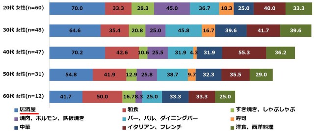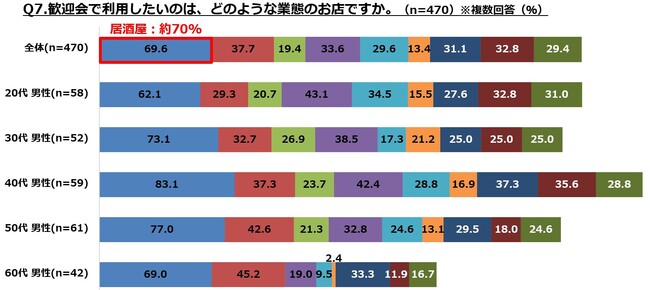 ・利用したいお店は「居酒屋」が7割で最も高く、女性では「イタリアン、フレンチ」が4割強で2位。