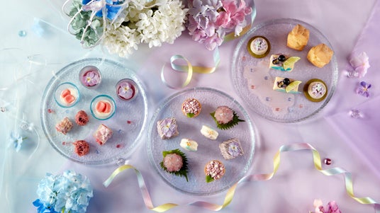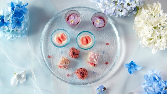 下段のセイボリープレートでは、自家製の出汁を使用した濃厚なゼリーの味わいの「花の紫ムース」をはじめ、「紅白玉のクリームチーズ餡」や、色鮮やかな「あじさい色生春巻き」など、紫陽花をイメージする色合いと食材を使用し、和食レストランならではの和風セイボリーをお楽しみいただけます。