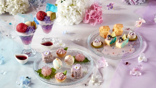 キラキラ輝く紫陽花をイメージした「紫陽花パフェ」や「キャンディーレアチーズケーキ」、「花の紫ムース」。