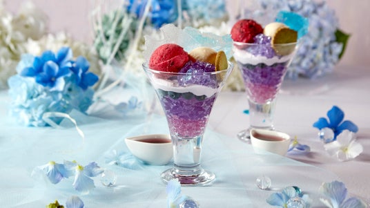 続いて梅雨の紫陽花の美しさをそのまま切り取ったような「紫陽花パフェ」をご用意。2色の飴とゼリーできらめくパフェは、見た目だけではなくナタデココや飴などの食感もお楽しみいただけるように仕上げ、お好みで別添えのブルーベリーソースを加えてお召し上がりいただけます。