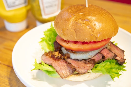 世羅産の肉と野菜にこだわった贅沢なハンバーガー。柔らかく味わい深い世羅牛ステーキ肉にオリジナルのガーリックソースが抜群にマッチ。1,850円。